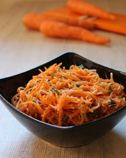 Інгредієнти: 1 кг моркви, півсклянки олії, 2 ч. ложки оцту, 2 ст. ложки цукру, 1 ст. ложка солі, 1 ч. ложка чорного перцю, 1 ч. ложка червоного перцю. Також можна використовувати магазинну приправу для моркви по-корейськи, додавати коріандр, каррі, часник і цибулю за смаком.