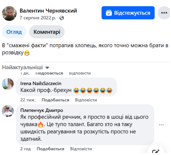 "Як професійний речник, я просто в шоці від цього чувака. Це тупо талант. Багато хто на таку швидкість реагування та розкутість просто не здатний", - написав у коментарях Плетенчук.