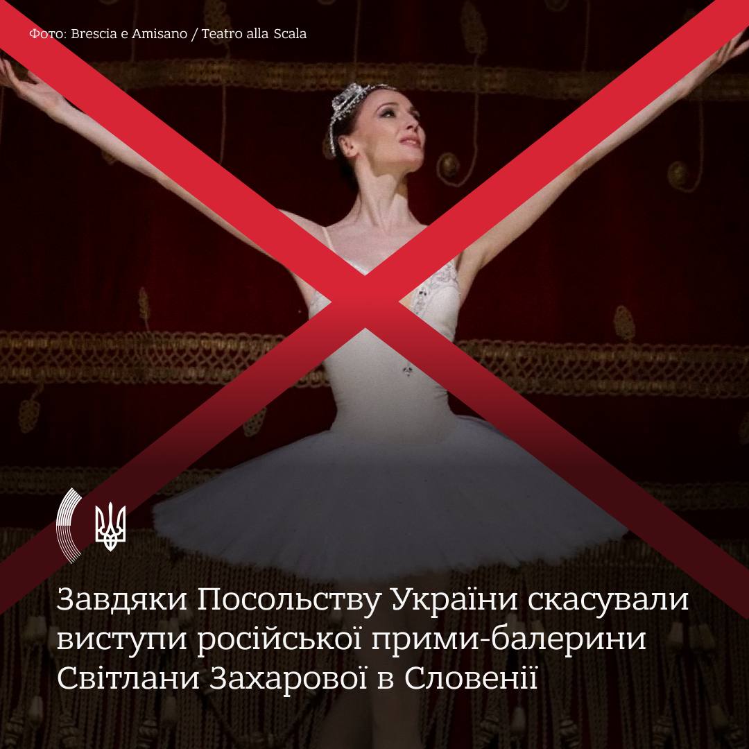 Поки одні солідарні з Україною країни Євросоюзу скасовують виступи російських діячів культури, інші продовжують допускати або повертати на європейську сцену артистів з країни-терористки, попри критику і протести українців. На початку місяця українські активісти спільно з зусиллями посольства України в Словенії та міністерства закордонних справ України домоглися скасування концерту в Любляні російської прими-балерини Світлани Захарової, яка є відкритою прихильницею Володимира Путіна та військової агресії проти України. Тепер стало відомо, що виступ путіністки на Люблянському фестивалі таки відбудеться, проте у скороченій формі.