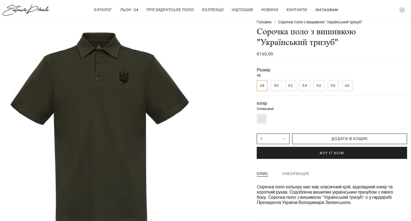 У гардеробі Володимира Зеленського є схожа сорочка з вишивкою цього бренду – кольору хакі під назвою "Український тризуб". Ціна президентського поло – 165 євро.