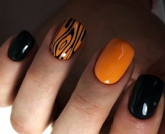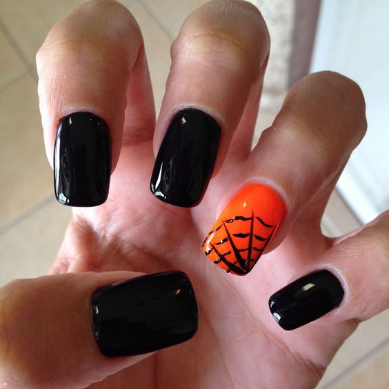 Кольори традиційні для Хелловіна - чорний і помаранчевий. Тому такий варіант манікюру завжди буде безпрограшним. Ви можете покрити основну частину нігтів чорним, а на інші нанести помаранчевий лак, на якому буде добре виглядати дизайн, наприклад, імітація павутини.