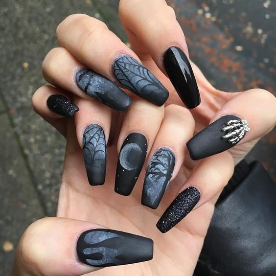 Любителькам всього незвичайного пропонуємо зробити чорний матовий манікюр з малюнками, павутиною і навіть декором у вигляді руки мерця.