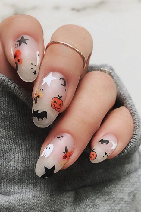 Для тих, хто хоче створити більш ніжний образ і не хоче покривати нігті темними кольорами, завжди можна підібрати дизайн в нюдовом кольорі, прикрасивши його блискітками і малюнками милих привидів.