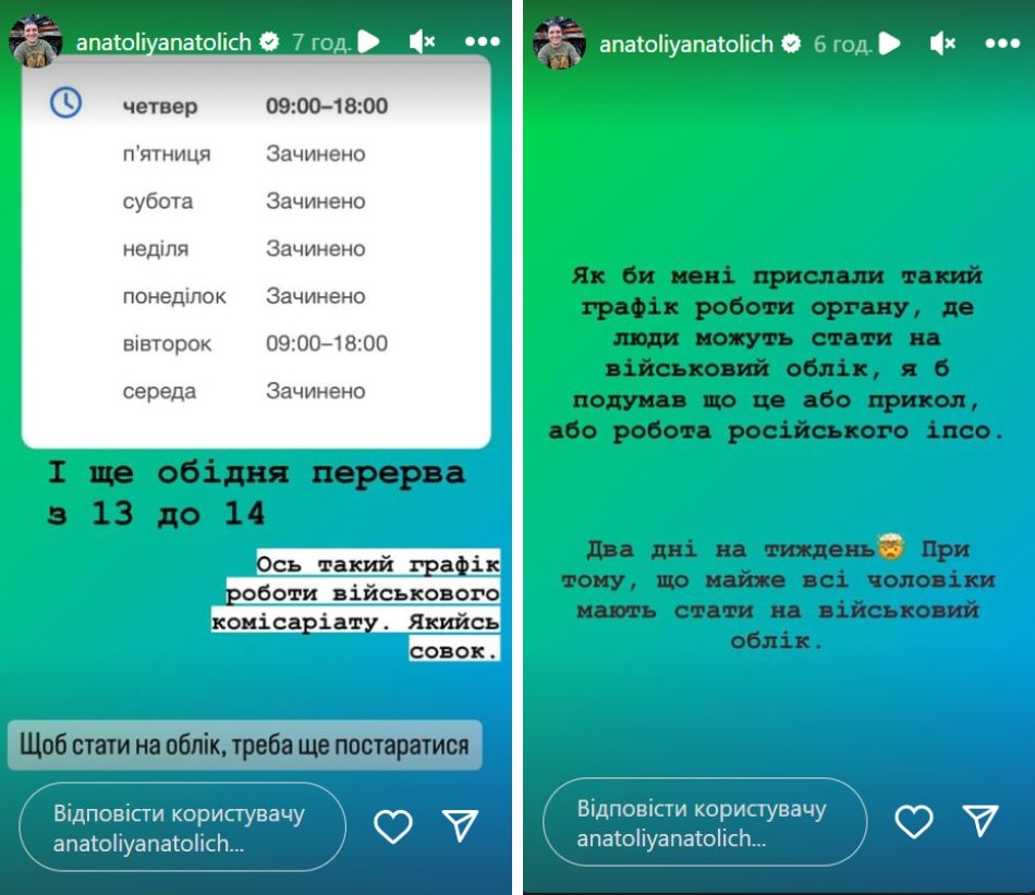 "Ось такий графік роботи військкомату. Якийсь "совок". Щоб стати на облік, треба ще постаратися, - обурився він. - Якби мені надіслали такий графік роботи органу, де люди можуть стати на військовий облік, я б подумав, що це чи прикол, або робота російського ІПСО. Два дні на тиждень. При тому, що майже всі чоловіки мають стати на військовий облік".