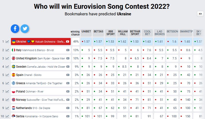 До того ж, представник України має великі шанси стати переможцем нинішнього року. Після виступу в першому півфіналі гурт Kalush Orchestra закріпив свої позиції в букмекерській таблиці. На сьогодні коефіцієнт становить 49%.