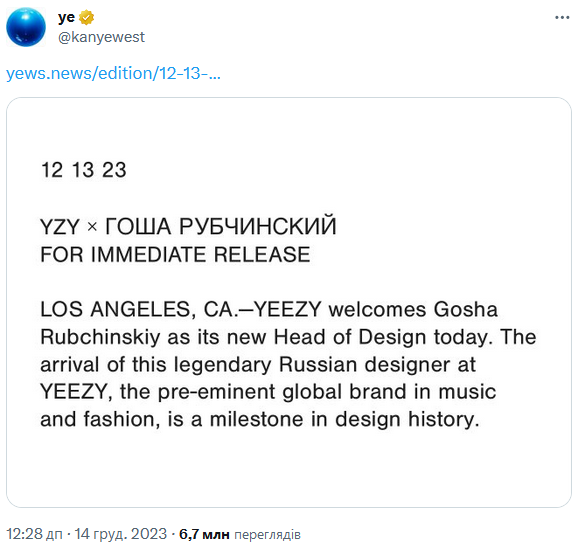 "Yeezy вітає Гошу Рубчинського як нового керівника відділу дизайну. Прихід цього легендарного російського дизайнера в Yeezy, провідний світовий бренд у музиці та моді, є важливим досягненням в історії дизайну", - йдеться у релізі компанії, опублікованому Вестом.