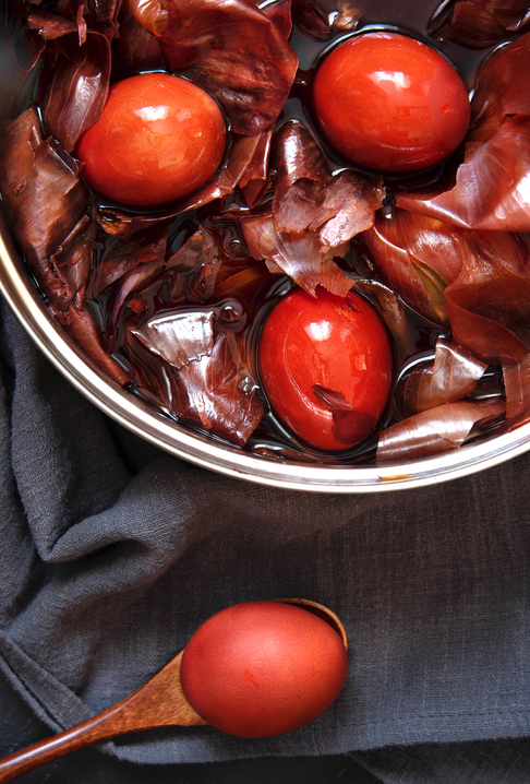 Відвар з цибулиння пофарбує яйця на Великдень в красивий червоно-коричневий колір . Добре промийте яйця за допомогою харчової соди. Лушпиння 7-10 цибулин сполосніть, покладіть в каструлю і залийте 1,5 л води. Щоб колір яєць вийшов більш насиченим, додайте 1 чайну ложку укусу. Яйця варіть протягом 25 хвилин на повільному вогні. Щоб вони не потріскалися, можна додати у відвар щіпку солі.