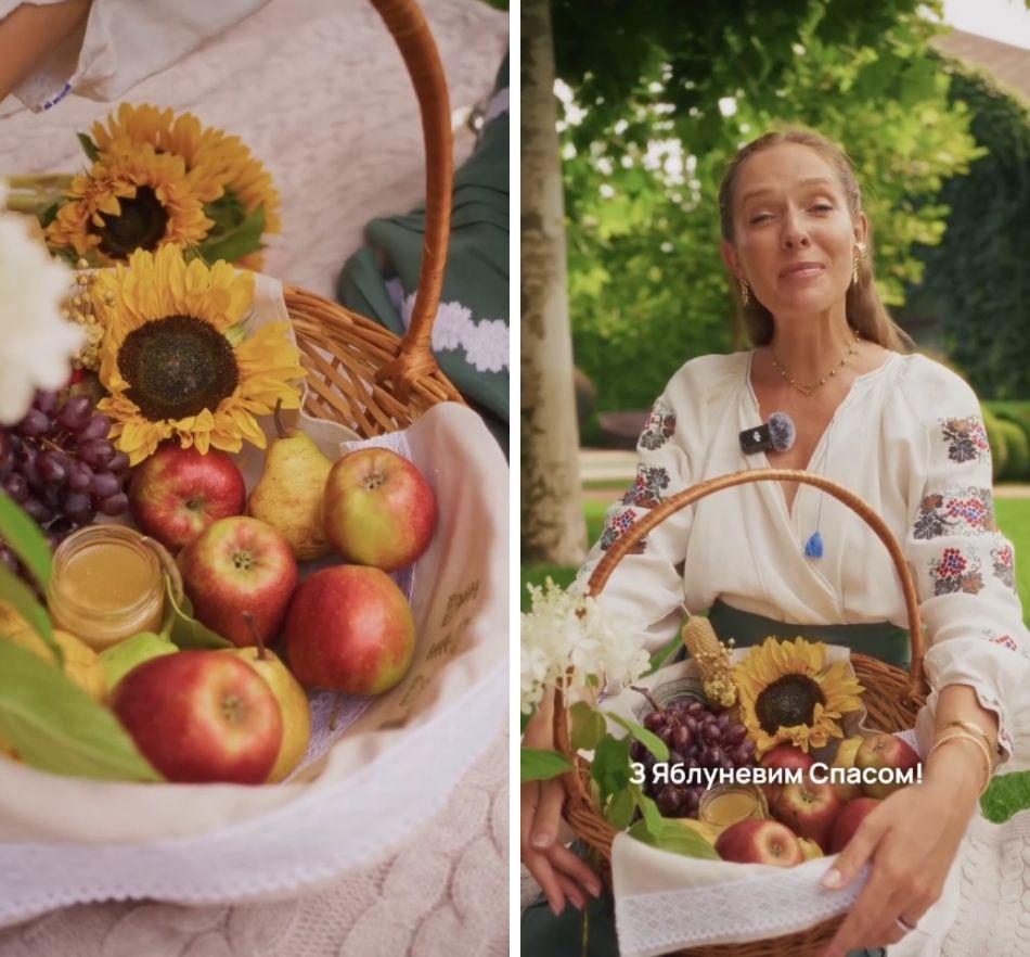 На своїй сторінці в Instagram вона поділилася атмосферним відео з власного саду, і розповіла, що обов'язково кладе у святковий кошик: яблука, груші, виноград, мед, свічку, квіти.