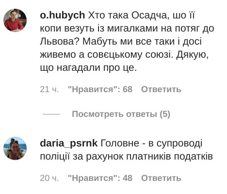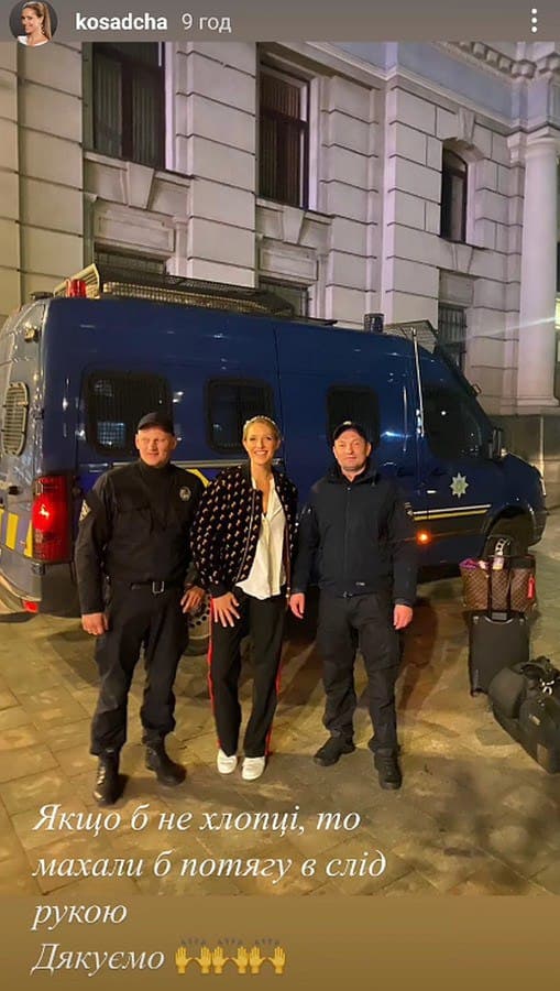 Фотографіями своєї пригоди Осадча поділилася в Instagram-історіях, але пізніше видалила їх через критику. "Якби не хлопці, то махали б потягу вслід рукою", - підписала знаменитість світлину на тлі поліцейського автомобіля та валіз.