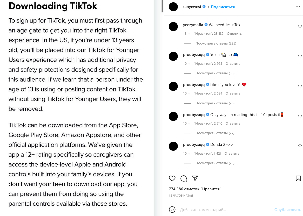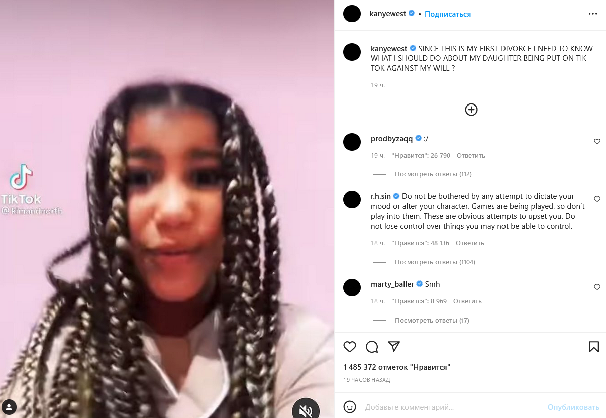 У наступній публікації Вест нагадав Кардаш'ян, що дітям молодше 13 років заводити аккаунт у TikTok заборонено.
