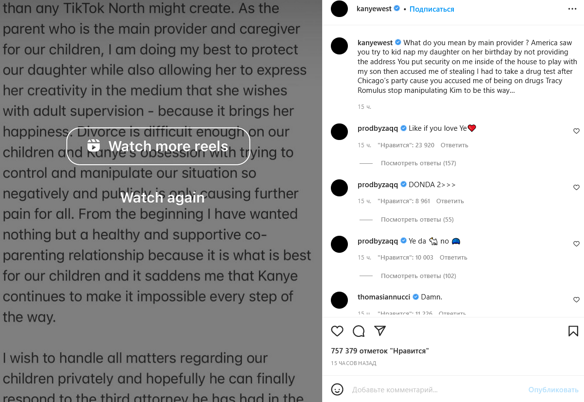Кардаш'ян не стала відмовчуватися і відразу відреагувала на публікацію Веста у себе в "сторіз". Зірка реаліті-шоу звинуватила екс-коханого в постійних публічних нападках, стверджуючи, що він одержимий спробами "контролювати і маніпулювати" їх розлученням.