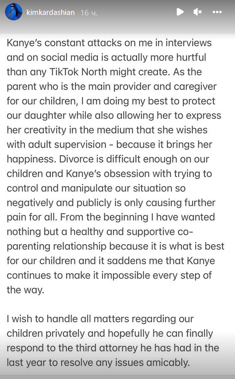 "Постійні нападки Каньє на мене в інтерв'ю та соціальних мережах насправді більш шкідливі, ніж будь-який TikTok Норт, - пише Кім. - Як мати, яка є основним годувальником та опікуном наших дітей, я роблю все можливе, щоб захистити нашу дочку, а також дозволяю їй висловлювати свою творчість у тому середовищі, в якому вона хоче, під наглядом дорослих - тому що це приносить їй щастя. Розлучення досить важке для наших дітей, і одержимість Каньє спробами контролювати та маніпулювати нашою ситуацією так негативно та публічно, ще більше завдає всім нам болю".