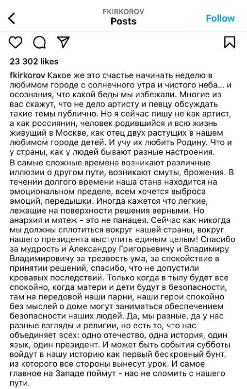 Поки колона найманців рухалася на Москву, їм вдалося збити літак і кілька гелікоптерів, знищивши їхні екіпажі. Сам Пригожин стверджував, що напередодні авіація РФ завдала по тиловому табору "вагнерівців" удару, вбивши близько 30 осіб. Кіркоров, який уявив себе експертом, назвав такі події "першим в історії безкровним бунтом" та "уроком для Заходу".