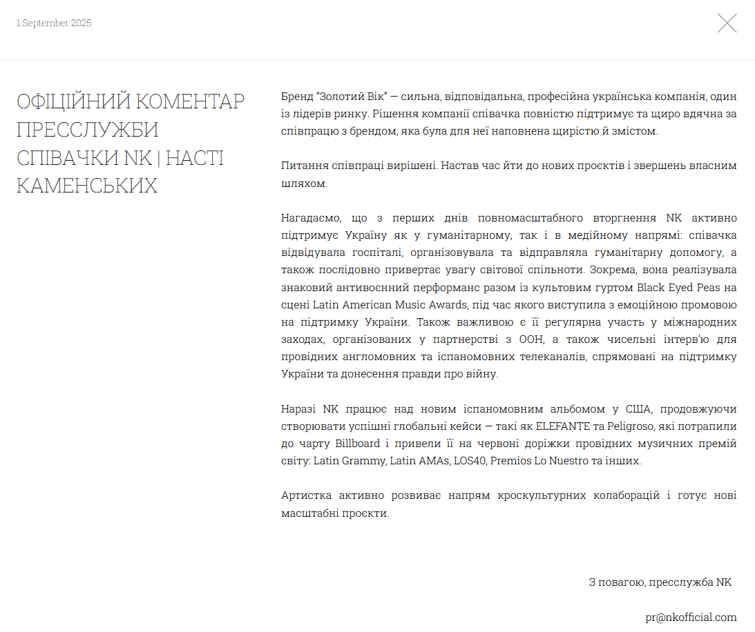 "Бренд "Золотий Вік" - сильна, відповідальна, професійна українська компанія, один із лідерів ринку. Рішення компанії співачка повністю підтримує та щиро вдячна за співпрацю з брендом, яка була для неї наповнена щирістю й змістом. Питання співпраці вирішені. Настав час йти до нових проєктів і звершень власним шляхом", - зазначили представники NK.