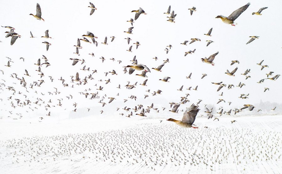 Абсолютним переможцем цього року став знімок під назвою "Зимова міграція" фотографа з Норвегії Терьє Колааса. Свій переможний кадр, на якому зображений масовий переліт розоногих гусей, норвежець зробив за допомогою дрону.