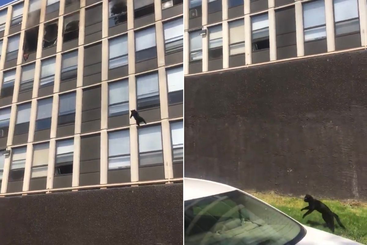 Крізь клуби диму в розбитому вікні з'явився чорний кіт. Деякий час він перевіряв лапами стіну, а потім стрибнув вниз. Люди закричали від страху, бо вирішили, що пухнастий впаде на бетонну стіну. На щастя, він приземлився на невелику ділянку м'якої трави, відскочив від землі, а потім втік.