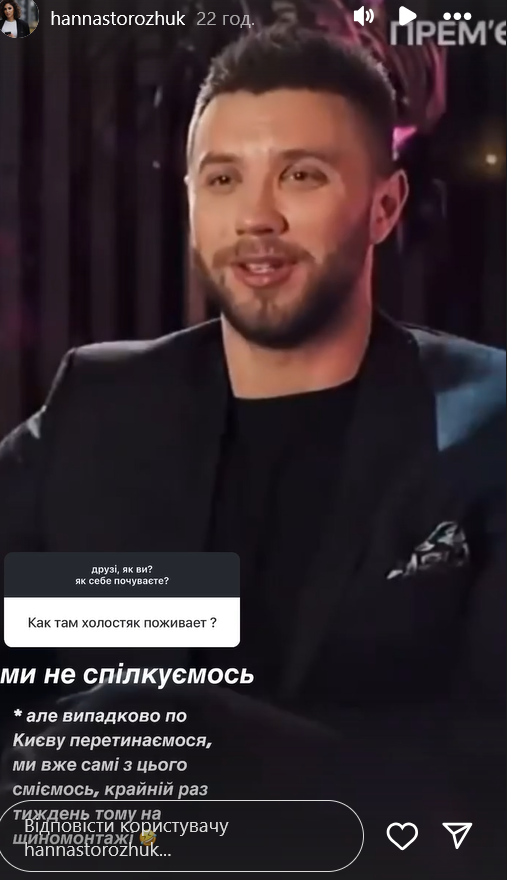 Переможниця реаліті влаштувала в Instagram-історіях день відповідей на запитання, частина яких стосувалася її участі в проєкті та стосунків із головним героєм. На коментар підписниці "Як там Холостяк поживає?" Анна відповіла, що вони з Михайлом не спілкуються. "Але випадково по Києву перетинаємося, ми вже самі з цього сміємось, крайній раз тиждень тому на шиномонтажі", - додала вона.