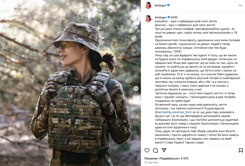 Христина Остапчук (Горняк), яка після розлучення з Володимиром Остапчуком у жовтні 2022 року продовжує носити його прізвище, пройшла курс молодого бійця. У своєму Instagram блогерка поділилася емоціями від триденної військової підготовки і пояснила, чому вважає, що всім жінкам варто відвідати такі курси.