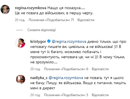 "Дивно тільки, що про неповагу пишете ви, цивільна, а не військова! У мене тут їх багато, можливо побачать і прокоментують, неповага це чи ні! В чому тільки, незрозуміло…", - відповіла блогерка. Її відповідь підтримала українська військова.