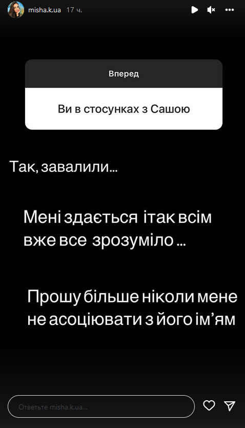 Відповідаючи на запитання фоловерів в Instagram-історіях, акторка попросила фанатів більше не асоціювати її з колишнім коханим. "Ви у стосунках із Сашею?", - поцікавилася одна з підписниць. На що Мішина відповіла: "Так, завалили... Мені здається і так всім вже все зрозуміло. Прошу більше ніколи мене не асоціювати з його ім'ям".