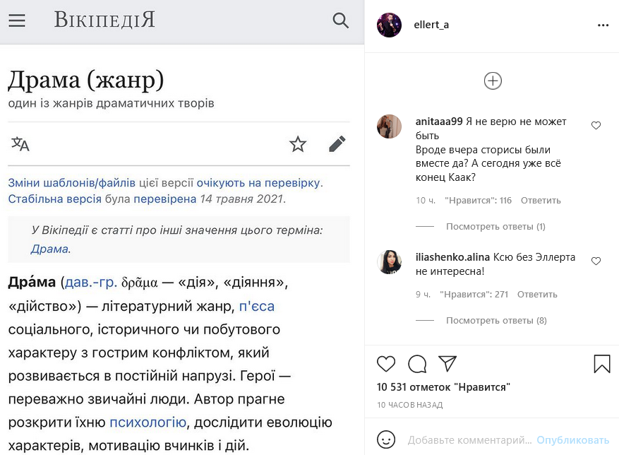 Еллерт після заяви Мішиної опублікував неоднозначний пост зі скріншотом з Вікіпедії, в якому пояснюється, що таке драма. Публікацію Олександр підписувати не став.