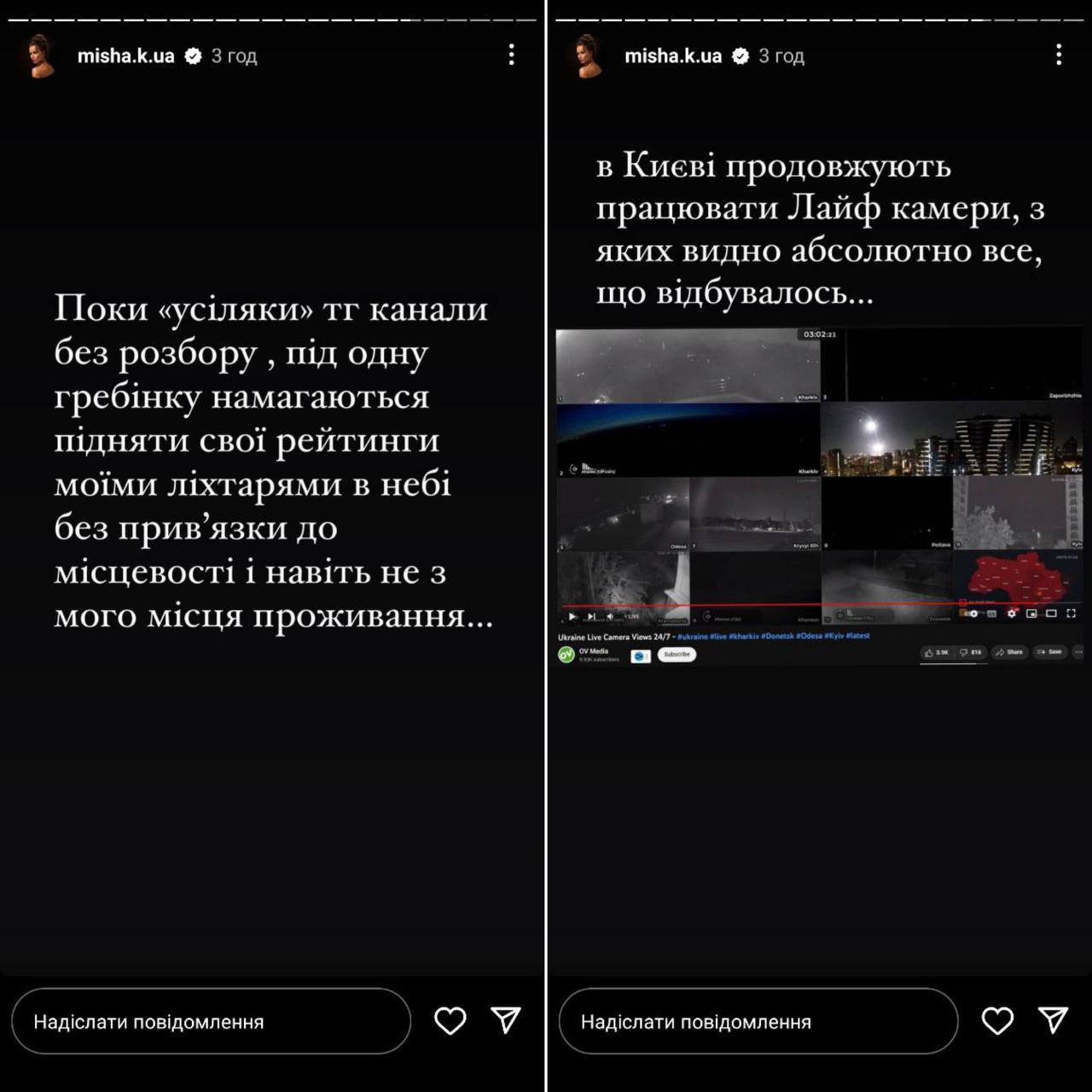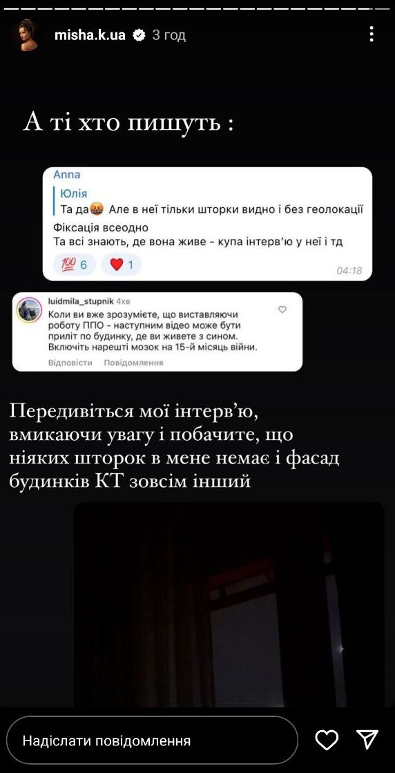 В Instagram-історіях акторка виклала "відео з ліхтариками", яке вона незабаром видалила після хвилі хейту. У наступних "сторіз" зірка поспішила дати відсіч всім, хто на неї накинувся. Мішина заявила, що вона не повідомляла локацію, а в ролику було лише "воєнне небо". Окрім того, Ксенія звернула увагу на те, що у Києві продовжують працювати онлайн камери, які все фіксують.