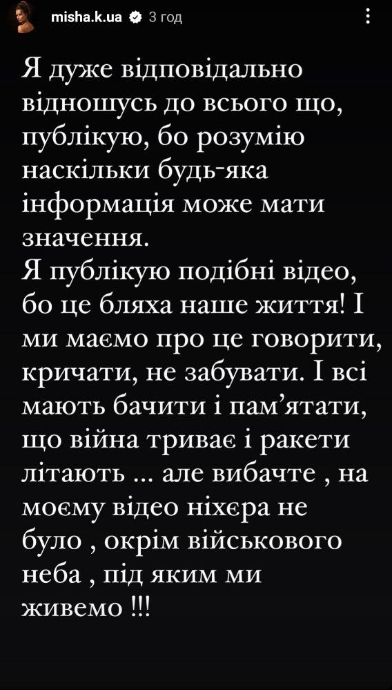 "Я публікую подібні відео, тому що це наше життя! І ми повинні про це говорити, кричати, не забувати. І всі повинні бачити і пам'ятати, що війна триває і ракети літають. Але вибачте, на моєму відео них*ра не було, окрім військового неба, під яким ми живемо!", – підсумувала Мішина.