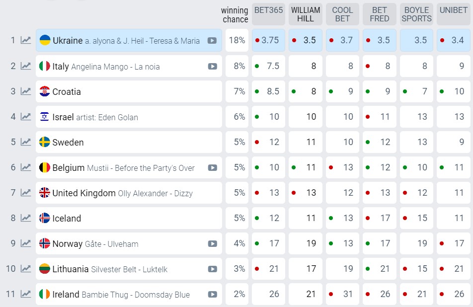 Букмекери оновили свої прогнози стосовно можливого переможця на "Євробаченні-2024". Так, лідерами залишаються представниці України alyona alyona і Jerry Heil з піснею про матір Терезу. На думку експертів, вони мають найбільше шансів зайняти перше місце, а саме - 18%.