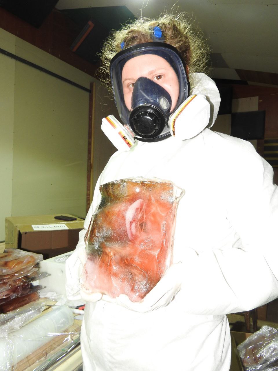 - десятиметрове полотно зі зшитих шкір "Можливо, там все ще буде дім…", що фіксує стан внутрішнього розриву та втрати відчуття дому.