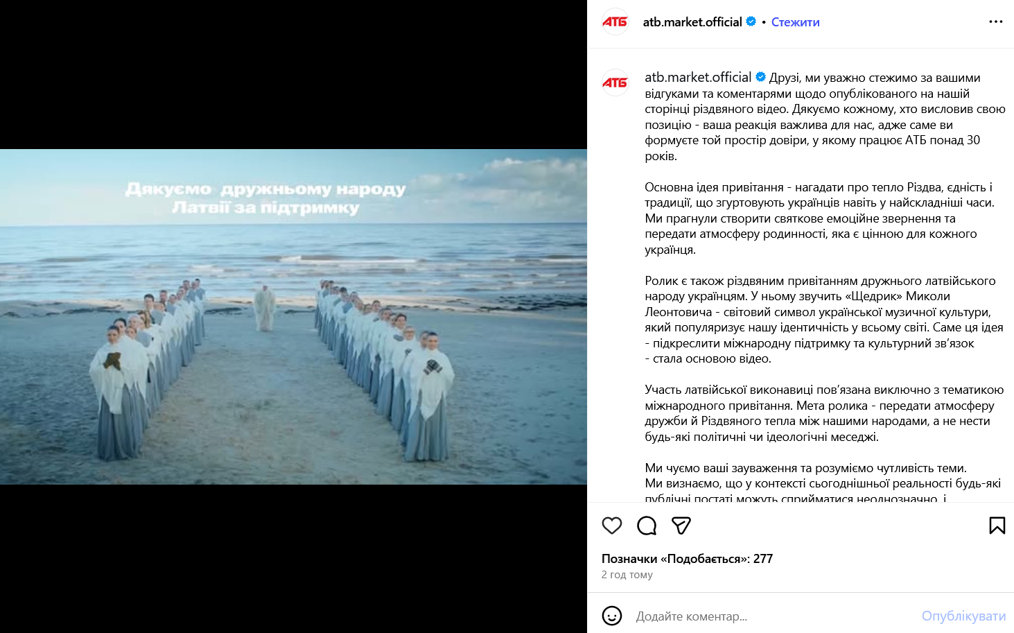 Після хвилі суспільного обурення АТБ видалив усі коментарі під дописом з різдвяним привітанням та обмежив можливість залишати нові. Натомість на сторінці компанії з'явилася нова публікація з поясненням вибору героїні відео: