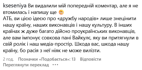Користувачів обурило видалення критичних коментарів з попереднього допису, про що вони написали під новим. Під свіжою публікацію українці продовжують засуджувати мережу АТБ за співпрацю з Лаймою Вайкуле.