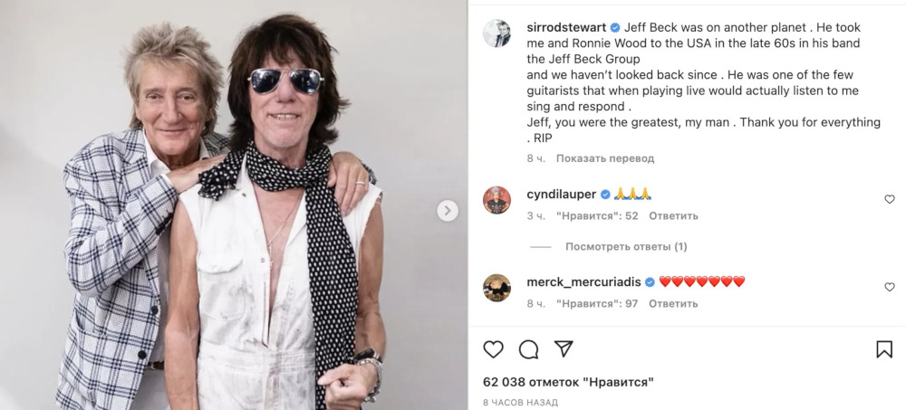 У відповідь на смерть товарша Род Стюарт написав у Instagram, що Бек "був одним із небагатьох гітаристів, які, граючи наживо, справді слухали спів та відповідали". "Джефф, ти був найкращим, мій друже", - сказав він.