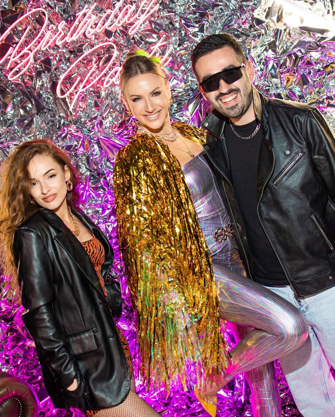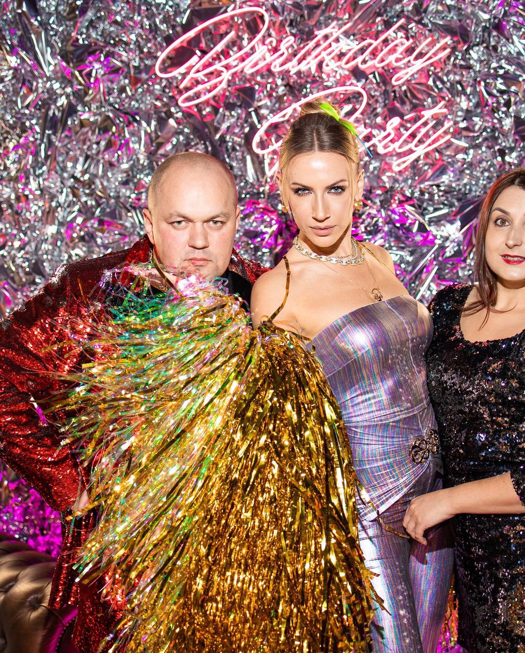 Сама іменинниця вибрала яскравий лук, вдягнувши на себе всі найблискучіше. Вона з'явилася на вечірці у сріблястому комбінезоні, який облягав її струнку фігуру, поверх якого накинула золотисту накидку з новорічної мішури.