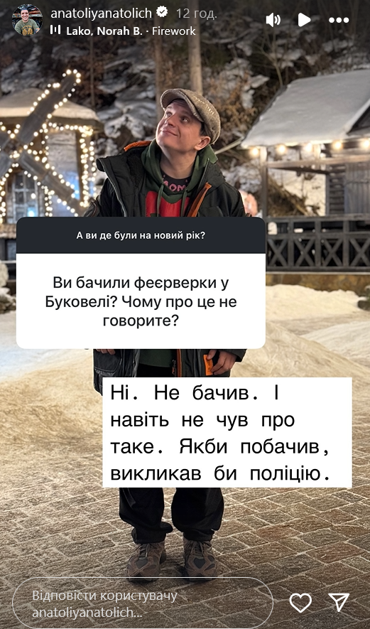 В Instagram-історіях Анатоліч заявив, що в Буковелі ніхто салюти не запускав. За його словами, він не бачив порушників, а також не знайшов про них інформації в інтернеті. Шоумен запевнив, що якби хтось у новорічну ніч вирішив би порушити закон і запустити піротехніку, то він би одразу викликав поліцію.