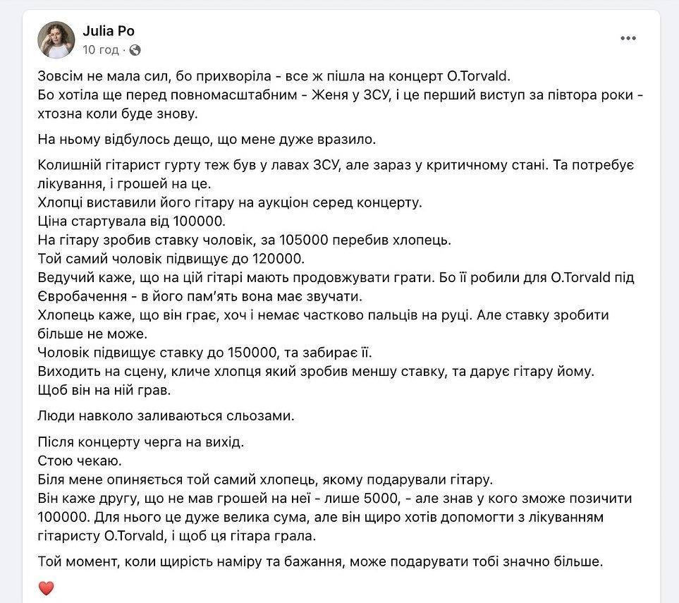 "Люди навколо заливаються сльозами. Після концерту черга на вихід. Стою чекаю. Біля мене опиняється той самий хлопець, якому подарували гітару. Він каже другу, що не мав грошей на неї - лише 5000, - але знав, у кого може позичити 100 000. Для нього це дуже велика сума, але він щиро хотів допомогти з лікуванням гітаристу O.Torvald, і щоб ця гітара грала. Той момент, коли щирість наміру та бажання може подарувати тобі значно більше", - йдеться у публікації відвідувачки.