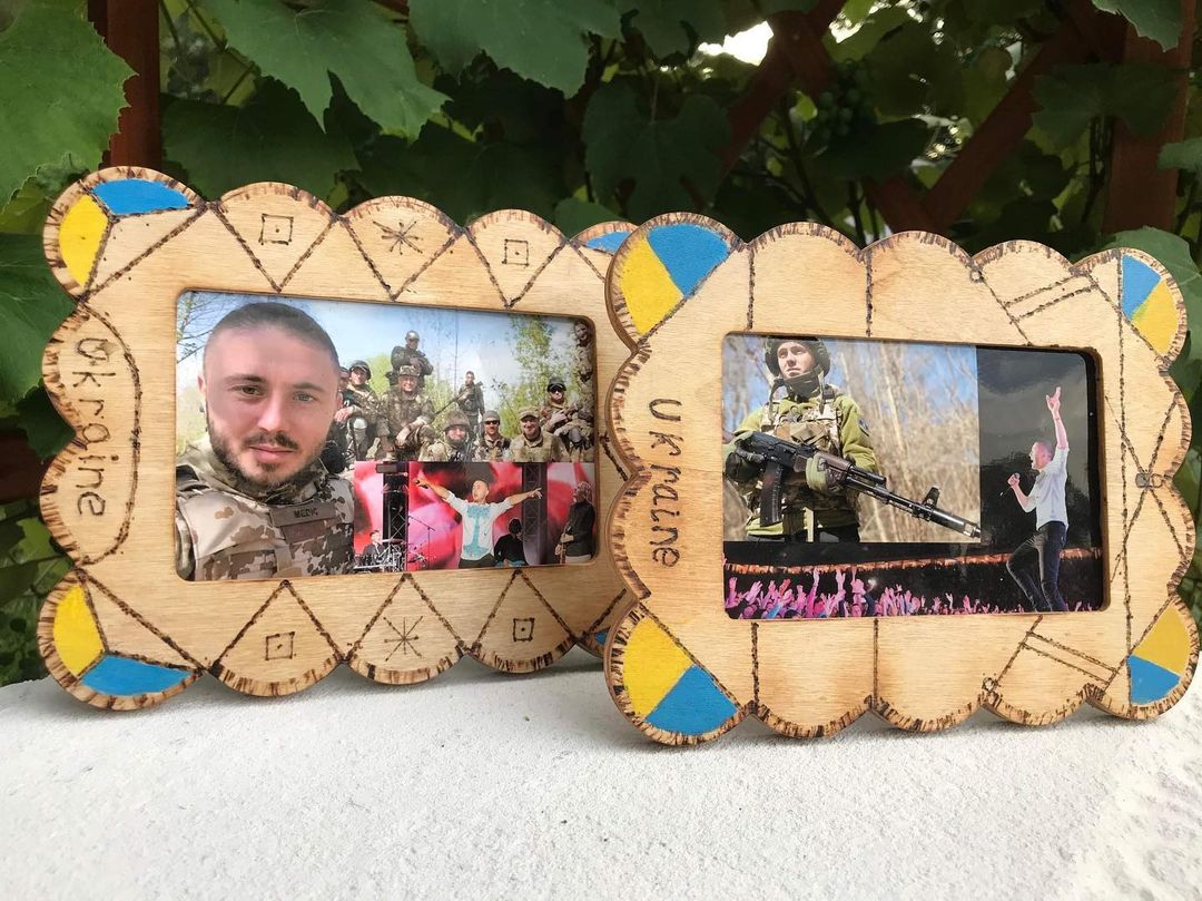 "Тепер ці два ексклюзивні сувеніри можна придбати у моїх синів. Як доставити - придумаємо. Частина виручених коштів піде на підтримку нашого батальйону, а саме на прилади нічного бачення, частина на нові матеріали для поробок, частина - дітям на цукерки. Стартова ціна - 3$ за рамку. Пропонуйте вашу ціну у коментарях", - написав музикант.