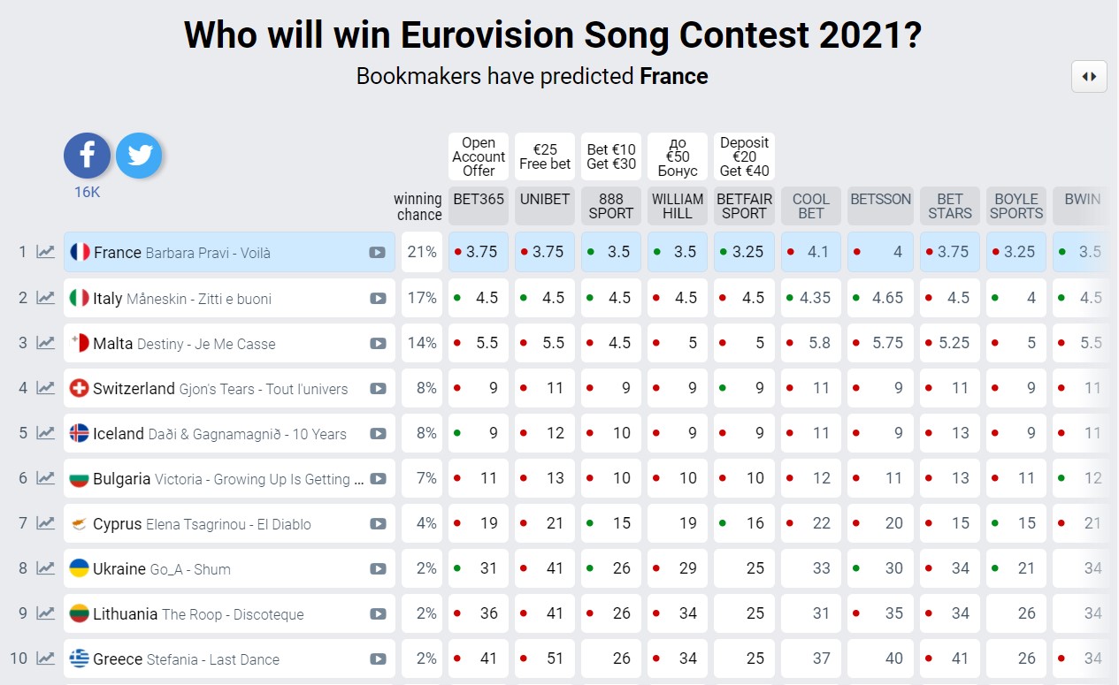 У Роттердамі (Нідерланди) тривають репетиції "Євробачення-2021", і ставки букмекерів змінюються з щодня. Останні кілька тижнів беззмінними фаворитками були представниці Мальти та Франції, але 14 травня прогнози істотно змінилися - Італія піднялася з четвертого рядка рейтингу на другий та потіснила Мальту.