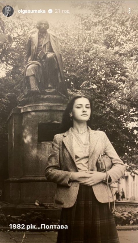 Відповідні кадри Ольга опублікувала на своїй сторінці в Instagram. На архівному кадрі вона позувала у 16-річному віці з темним волоссям, а позаду неї виднівся пам'ятник письменнику Миколі Гоголю, що розташований у Полтаві. "1982 рік Полтава", - йдеться у підписі до знімку.