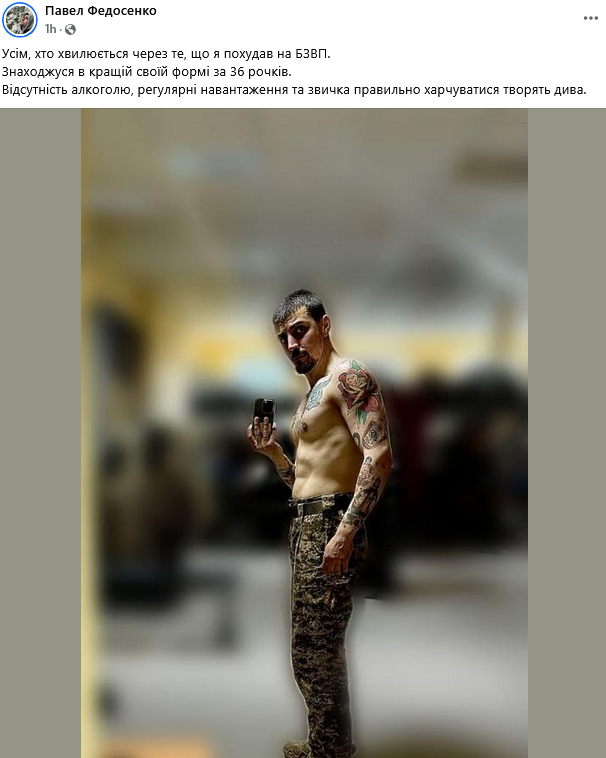 "Усім, хто хвилюється через те, що я похудав на БЗВП. Знаходжуся в кращій своїй формі за 36 рочків. Відсутність алкоголю, регулярні навантаження та звичка правильно харчуватися творять дива", - повідомив Павло Федосенко, додавши фотофакт.