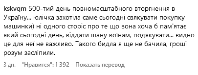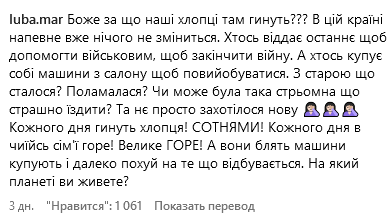Підписників Верби обурила не лише дорога покупка під час війни, а й той факт, що блогерка поїхала за машиною, коли у Львові була жалоба за загиблими внаслідок російського ракетного удару.