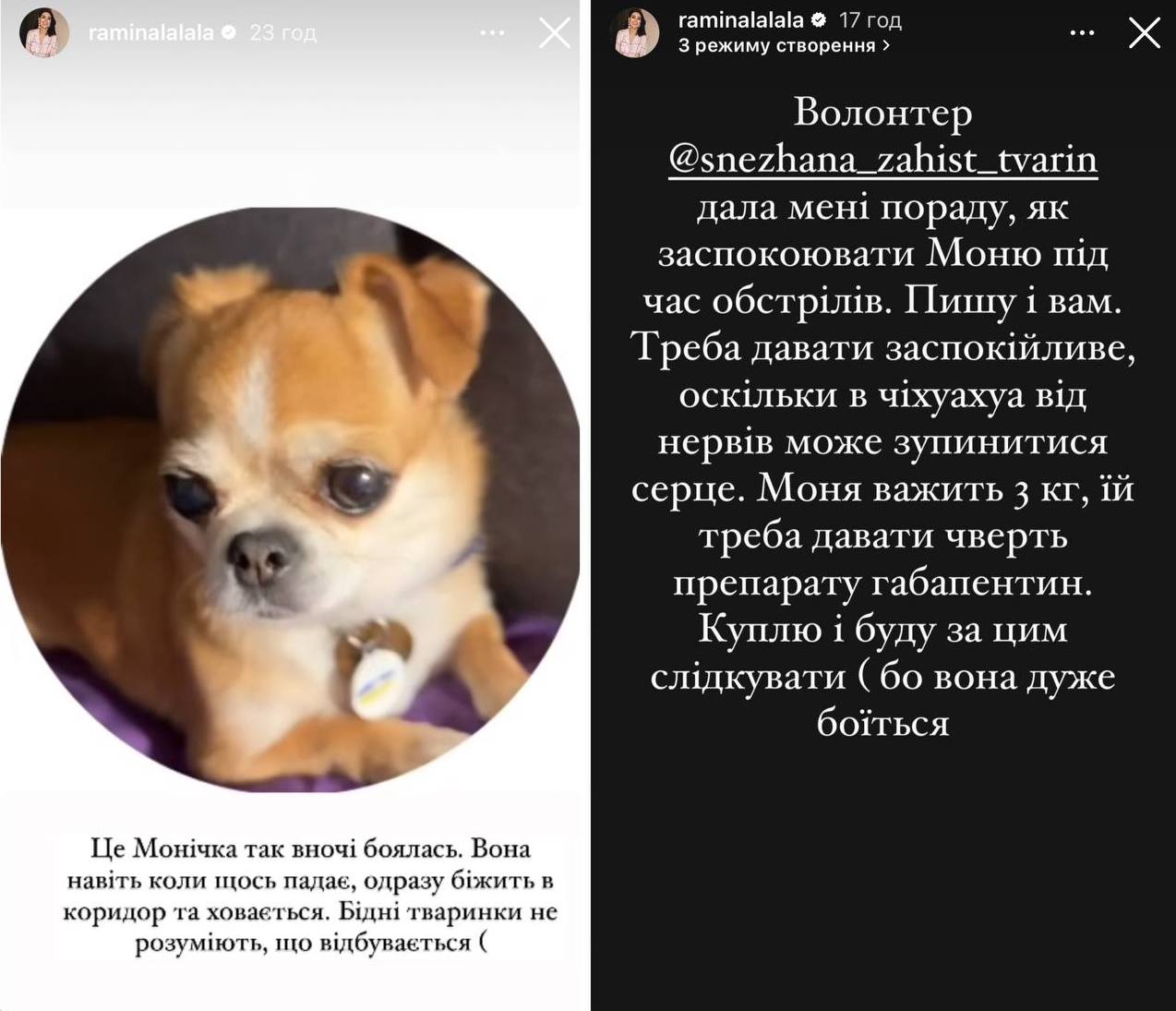 В Instagram-історіях журналістка поділилася, що одна з її собачок на ім'я Моня дуже боїться гучних звуків, а під час вибухів - ховається і тремтить.