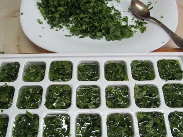 Подрібнюємо базилік, змішуємо його з оливковою олією та виливаємо суміш у формочки для льоду, як було описано вище.