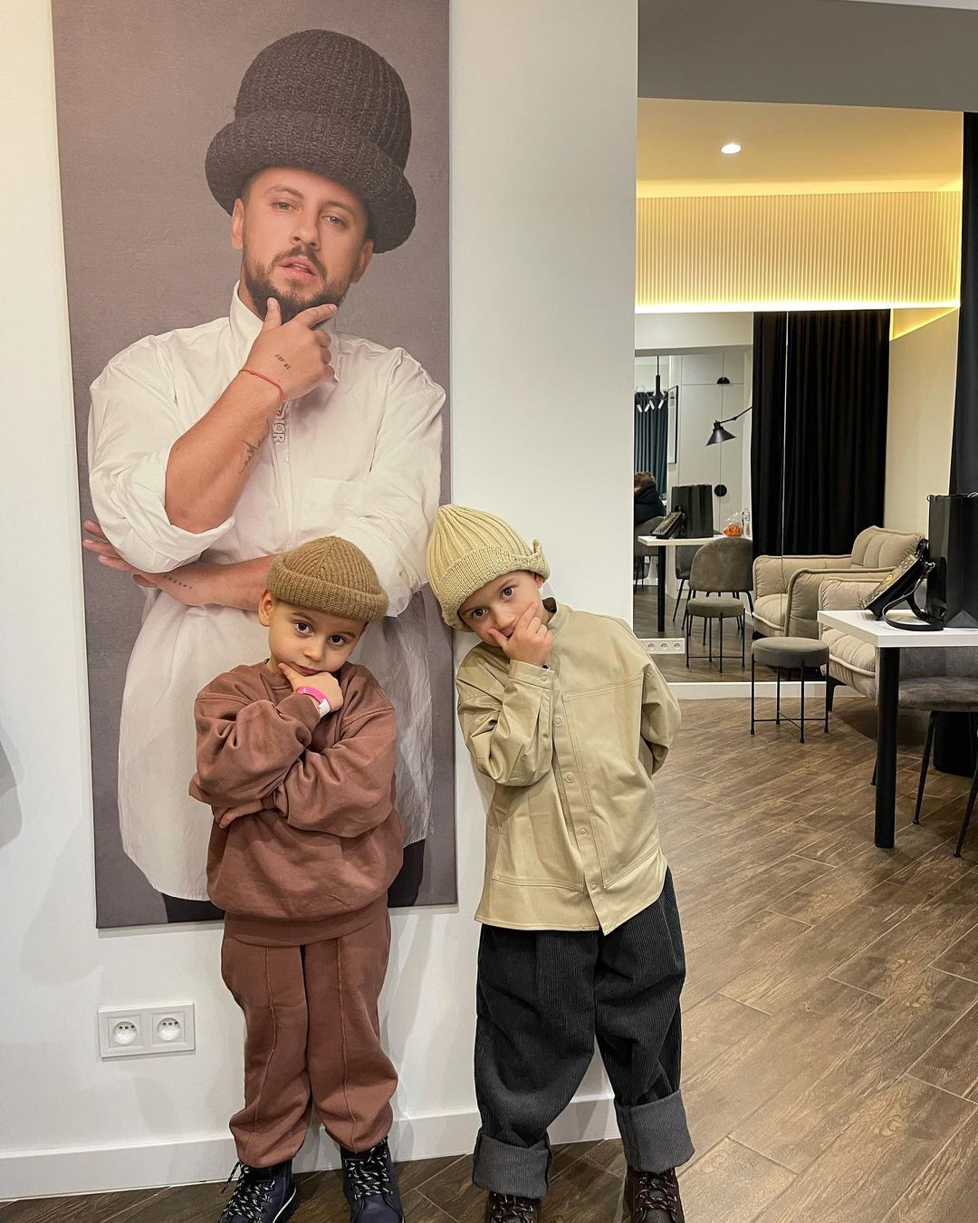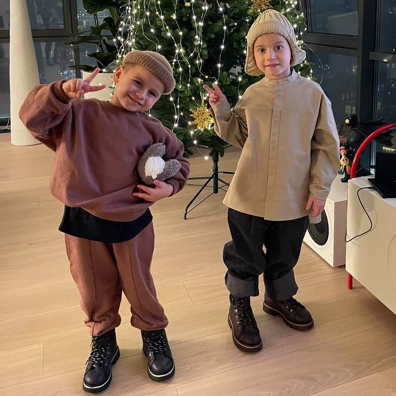Батьки завжди стильно одягають своїх хлопчиків, і цей раз не став винятком. Старший малюк зображений у широких джинсах та сорочці з коміром-стійкою, а його молодший брат - у модному трикотажному костюмі. На головах у хлопців шапки - схоже, вони успадкували від тата пристрасть до головних уборів.