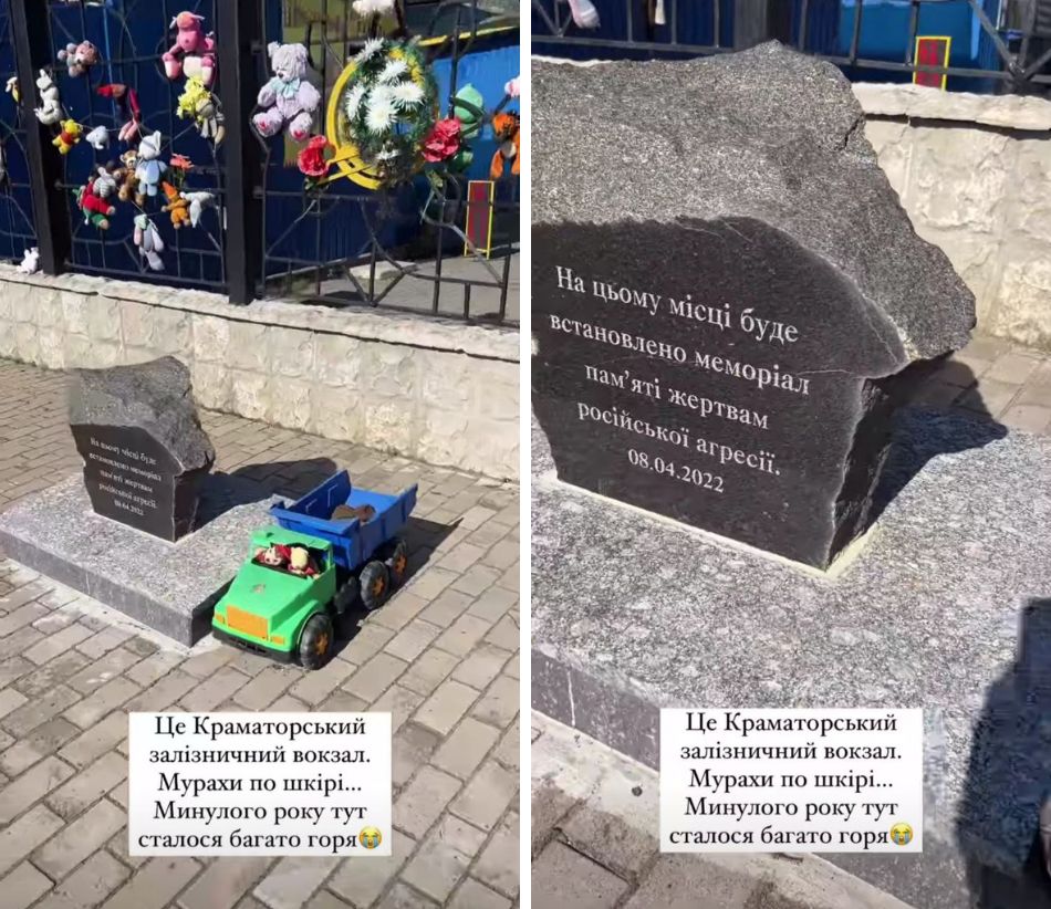 Віталій Козловський показав, як місце загибелі десятків українців виглядає сьогодні. На площі встановили пам'ятний знак, де колись буде встановлений меморіал жертвам російської агресії 8.04.2022 року. Біля чорного гранітного каменю стоїть іграшковий автомобіль. На залізному паркані за ним дбайливо прикріплені м'які іграшки на згадку про вбитих дітей.
