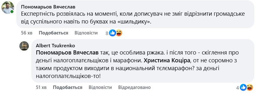 Придивившись до рекламного шильдика, розумієш, що не вгадав, що це з ефіру "Суспільного мовника". О, тепер картина прояснюється. Це значить якогось невизначеного зі статтю фріка запросили до студії, у дусі нинішньої політики рівності можливостей, політкоректності та свободи самовираження. Йдемо за посиланням. А там - у студії ведучий - цей самий, весь у бороді та стразах, а гостем у нього піарник Ковжун", - написав Єльцов.