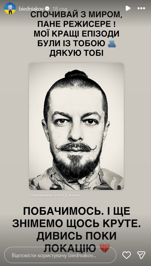 "Спочивай з миром, пане режисере! Мої найкращі епізоди були з тобою. Дякую тобі. Побачимося і ще знімемо щось круте. Дивися поки локацію", – написав Бєдняков у себе в "сторіз".