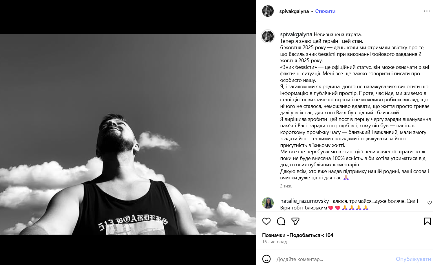 16 листопада Галина Співак повідомила в соцмережі, що її чоловік зник безвісти 2 жовтня - таку звістку вона отримала 6 жовтня.
