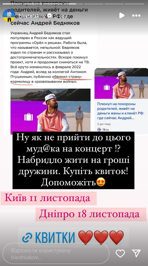 "Ну як не прийти до цього муд*ка на концерт!? Набридло жити на гроші дружини. Купіть квиток! Допоможіть", - написав Бєдняков.