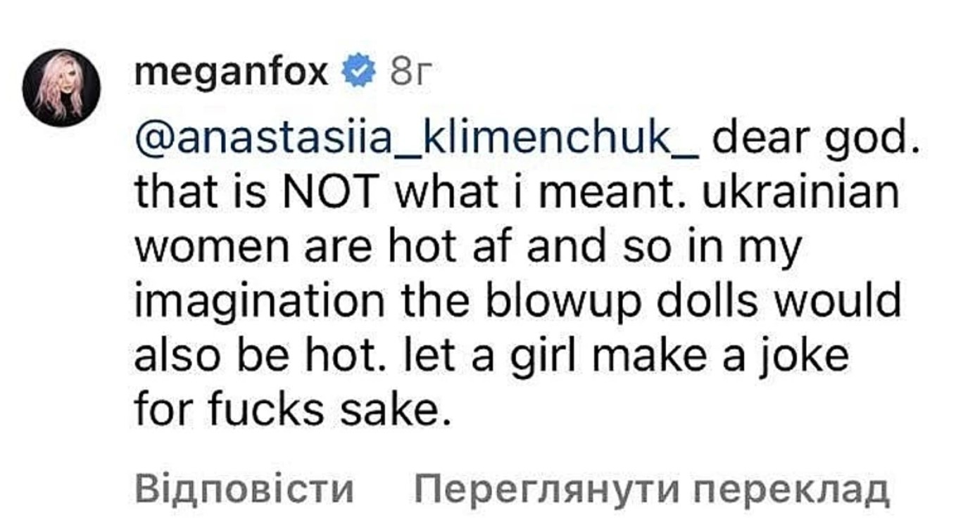 Американська акторка та модель Меган Фокс, яка у стосунках з репером Machine Gun Kelly, відзначилася невдалим жартом на адресу українок. Зокрема, говорячи про зовнішність наших жінок, вона чомусь вирішила згадати надувних ляльок.