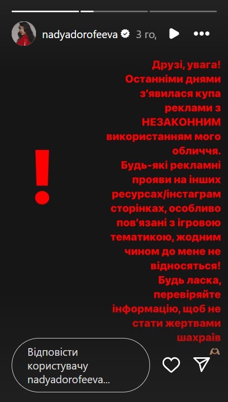 Про це виконавиця повідомила в Instagram-stories. Вона закликала підписників ретельно перевіряти інформацію та не реагувати на рекламу сумнівних продуктів чи послуг нібито за її участю. Зірка уточнила, що йдеться про просування ігрових ресурсів, задля яких використовують її фото. Артистка підкреслила що немає до подібного контенту ніякого відношення.
